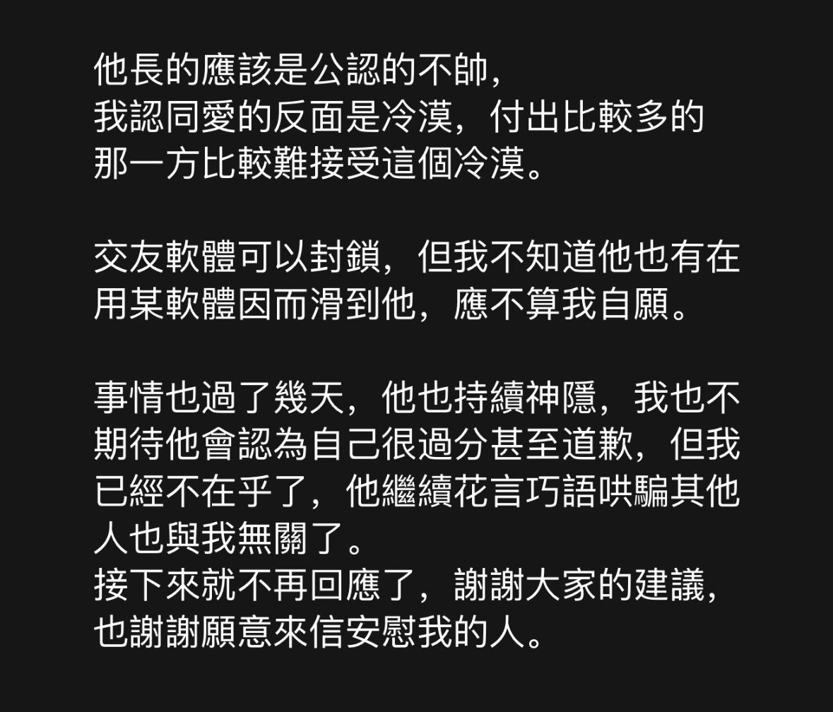 推 wwa928 : 沒啥好不平衡,就當對方死人然後當作人生成長的經驗 05/07 14:50