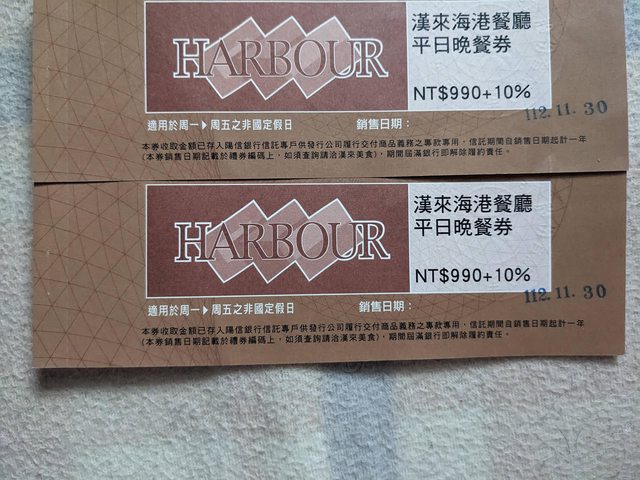 標題[商業] 出售漢來海港平日晚餐券2張