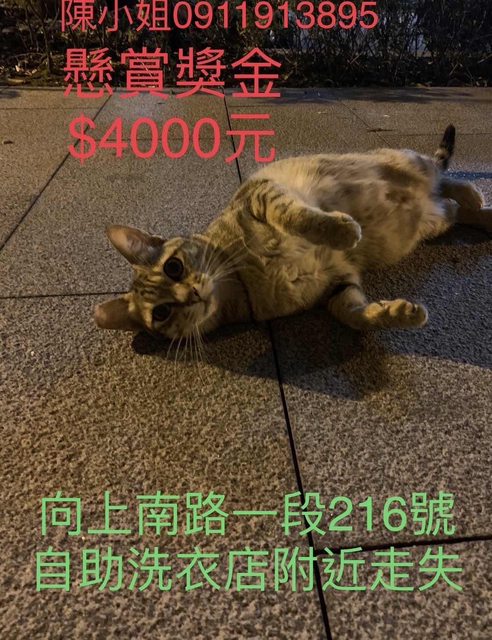 遺失地點: 台中市向上南路一段216號自助洗衣店附近 貓咪特徵:虎斑,有剪耳,個性膽小 貓咪性別:母 貓咪名字:小可愛 貓咪5/20清晨5點多疑似從三樓鐵窗逃跑,對敲罐頭聲音有反應 個性膽小,如找到的話請盡量能把她留在密閉空間 有懸賞金$4000元 請電陳小姐0911913895 https://i.imgur.com/6wF6cY1.jpeg