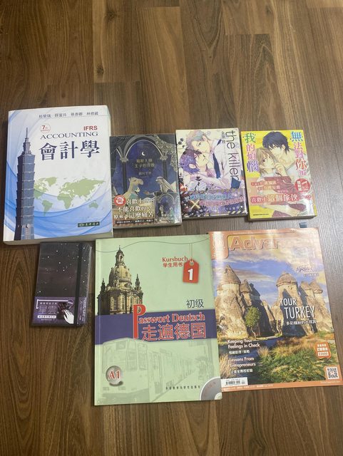 會計學教科書、BL漫畫3本、未拆封變色筆記本、德文教科書、彭蒙惠英語雜誌