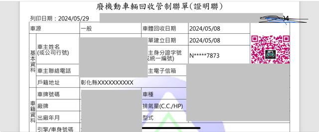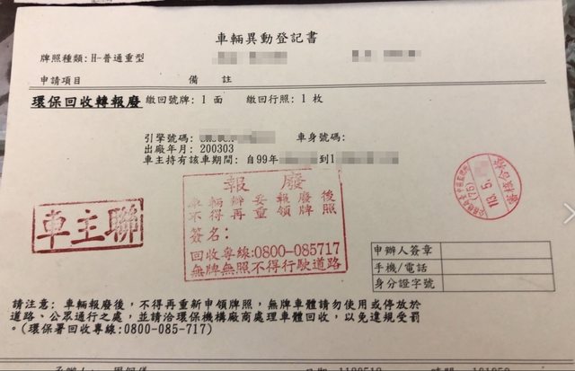 標題[其他] 售機車報廢單及回收單