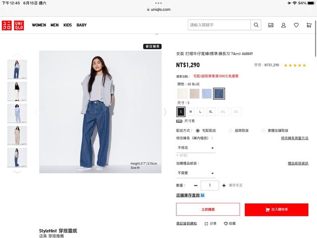物品:Uniqlo打褶牛仔寬褲 Blue 468848 尺寸S 日本購入