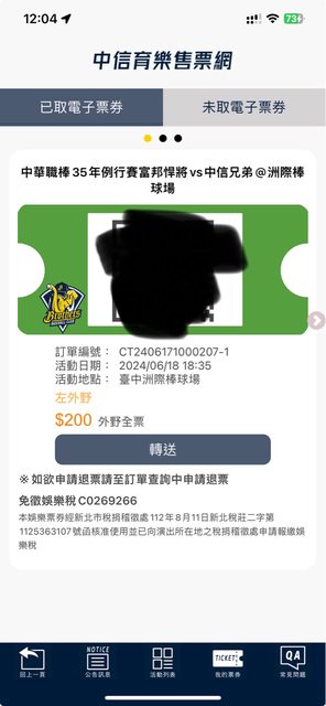 物品:6/18 中信 vs 富邦 外野門票