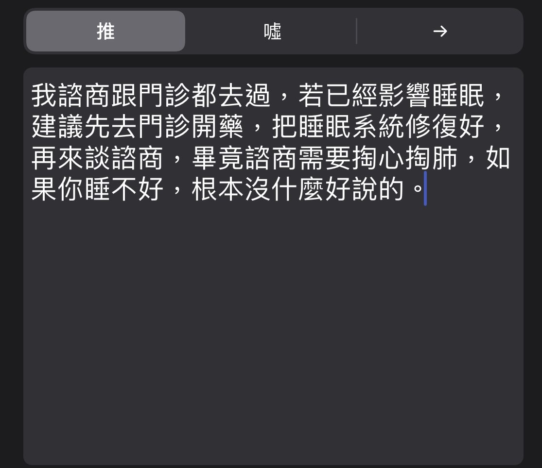 → POPBOBO: 很詳細聊很久。然後再靠藥物治療症狀。 1.170.96.72 06/30 01:25