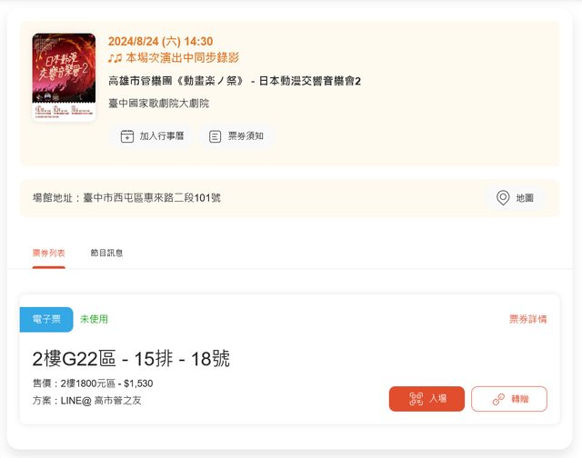 標題[交易] 8/24 台中歌劇院-日本動漫交響音樂會2
