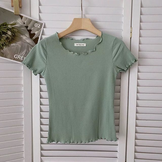 2. 草綠色木耳邊坑條上衣 尺寸F $50