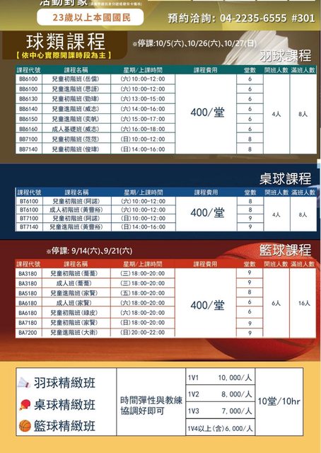 : 活動時間:9-10月的每個星期六18:00-20:00。9/7開始上課到10/26,兩天停課9/14、9