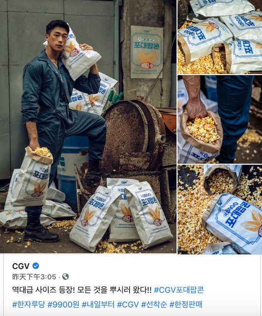 韓國知名戲院CGV近期推出「巨型布袋爆米花」的促銷手段,以猛男作為賣點的行銷大片