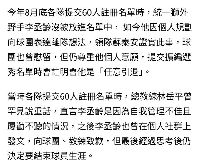 李丞齡將於擴編選秀時登記為任意引退選手