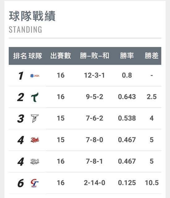 中職便會以0.003的勝率差掉到第5