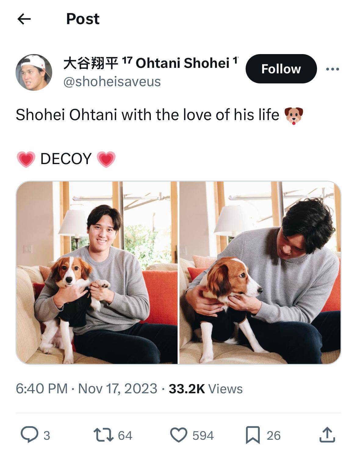 推 Yjizz: MLB也發推了: BREAKING: Shohei's dog is named Decoy! 12/15 07:50