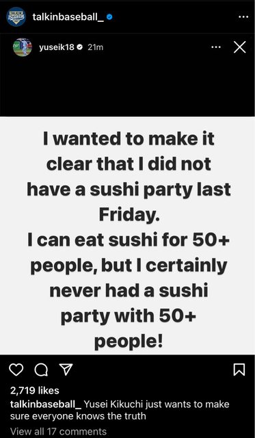 菊池哀居發文: 我想要澄清上禮拜五沒有壽司派對,我可以一個人吃掉50人份的壽司,但我很確定我沒有 舉辦50人的壽司派對。 -- ※ 發信站: 批踢踢實業坊(web-ptt.org.tw), 來自: 1.165.245.217 (臺灣) ※ 文章網址: https://web-ptt.org.tw/Baseball/M.1702653378.A.5B4