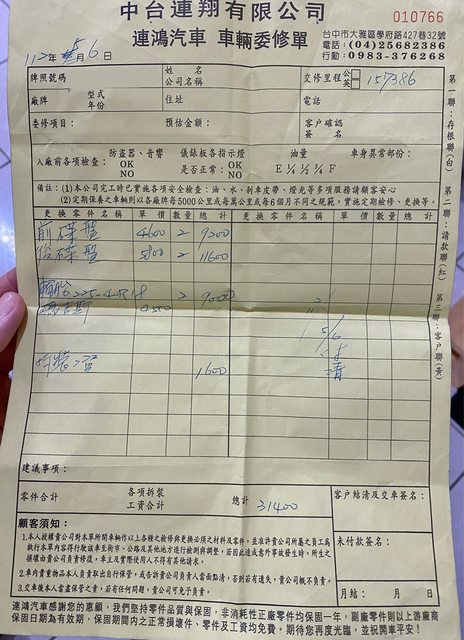 購入後已至保養廠確認車況皆正常,花了三萬多更換四輪碟盤與前輪兩顆瑪吉斯輪胎,以