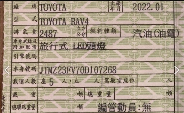 車輛品牌/產地/出廠年月: TOYOTA2022年O1月