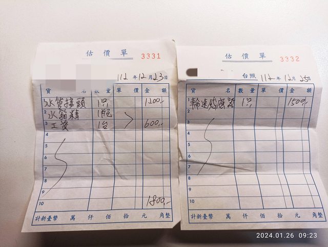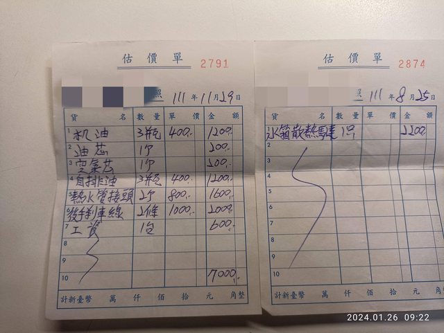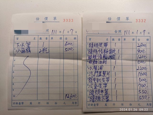開去給車行檢查說是連接鐵製接頭的水管老化需更換,費用約1千多