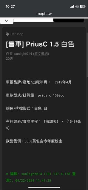 → LC945: 我遇到這個A車牌在B車賣的,倒是里程沒問題140.112.177.90 05/07 11:40