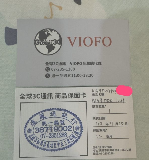 物品名稱:VIOFO A139 PRO 1CH(購自台灣總代理,保固內)單鏡頭,包裝盒上面寫2CH