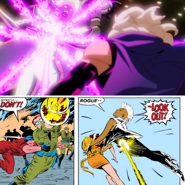 暴風女失去超能力的這一段情節,改編自漫畫《The Uncanny X-Men》#185 期中,亨利蓋