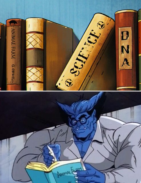 在原版卡通第一季第三集,野獸被逮捕關押後,就在監獄裡看《動物農莊》這本經典文學