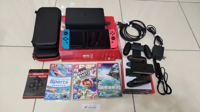 ★【物品名稱】:二手Switch OLED 紅藍主機+原廠配件,已貼玻璃貼,2個硬殼包,1個