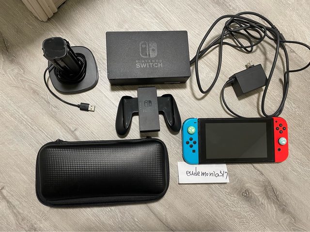 主機無記憶卡,原廠配件缺少joycon掛繩,附贈隨身包、joycon充電座