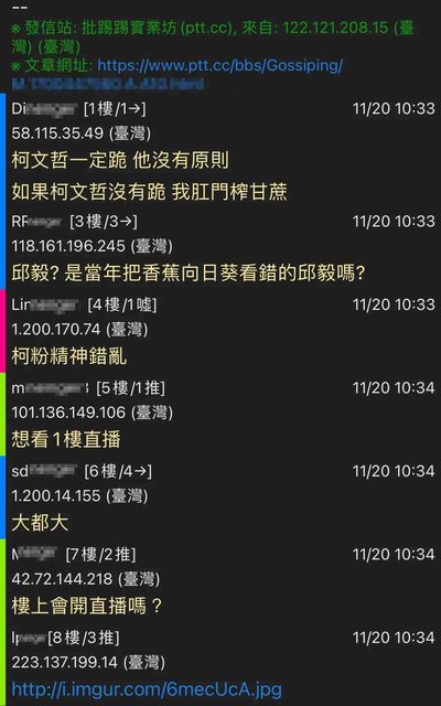 有鄉民篤定柯文哲一定跪,否則他肛門榨甘蔗。翻攝自論壇PTT 破萬鄉民留言熱議調笑,「你有想過甘蔗的感受嗎」、「我也想看榨汁,不 用給我喝」、「我幫忙出甘蔗錢」、「怎麼有這麼好的表演」、「快出來 不 要言而無信」、「你是不是等很久了?」、「不要亂祭獻」、「先洗乾淨」 、「笑死,裝死」。但也有人說,「登記完才算數啦,明天還有一天」。 https://i.imgur.com/5j5wMS2.jpg