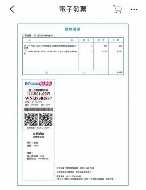 2.PCHOME購入,購買日期2022/01/24,保固7年。