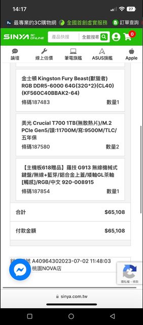 記憶體:金士頓 64GB(雙通32G*2) DDR5-6000 FURY Beast RGB