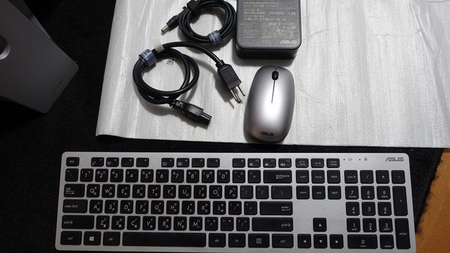 除原廠紙箱外,附贈鍵盤與滑鼠(接收器收納在滑鼠內)與外接電源均有