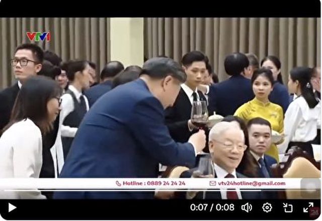 網友注意到,在越南播出的歡迎宴會視頻上(點這裡),習起身給越共總書記阮富仲敬酒