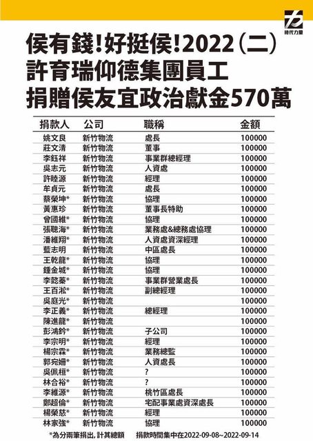 及2022年新北市長選舉中,仰德集團董事長許育瑞的旗下員工,在特定日期,以每人捐贈10
