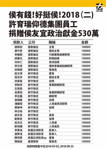 常整齊劃一的在特定的幾個日期,以每人捐贈10萬元的方式,提供侯友宜政治獻金,2018年