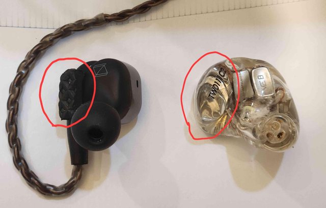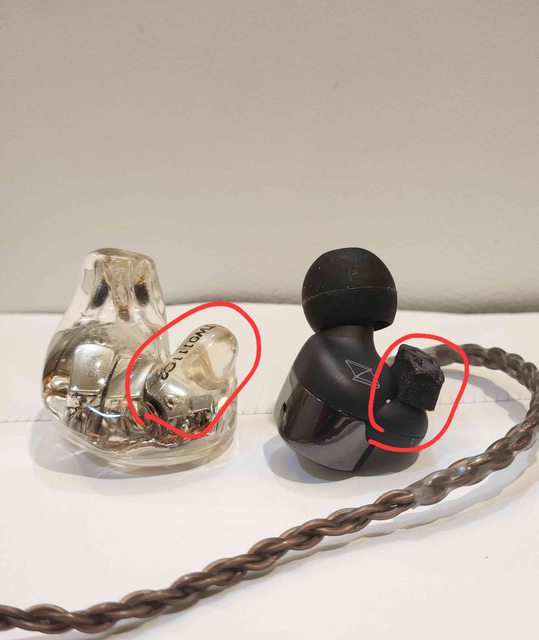 1.比較私膜跟n5005單體外型,可以發現紅圈比較的地方,私膜耳機這裡會凸一塊,讓單體