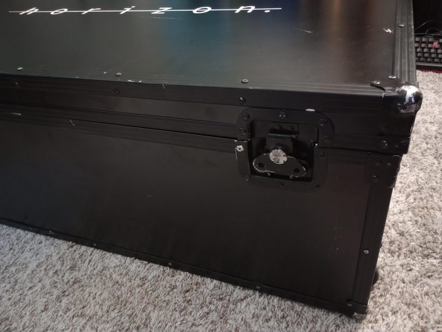 二手的航空箱上佈滿了包材還有貼紙, 外殼為木板和金屬包邊製成, 並附有把手