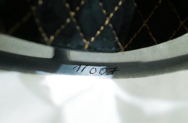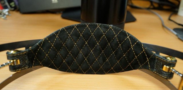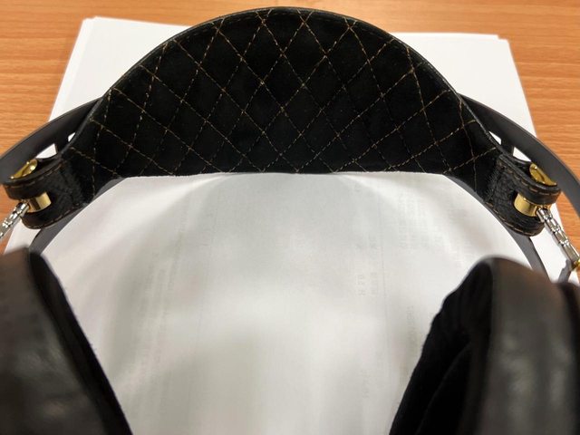頭帶的特寫,真的是從外面看低調樸實,壓紋皮壓RAAL,內側天鵝絨黑搭金線菱格紋,華