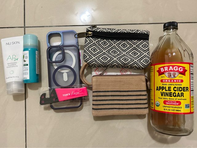 物品項目:全新牙膏、乾洗髮、兩個小零錢包、剩下1/5的蘋果醋、兩個I14的保護殼、粉