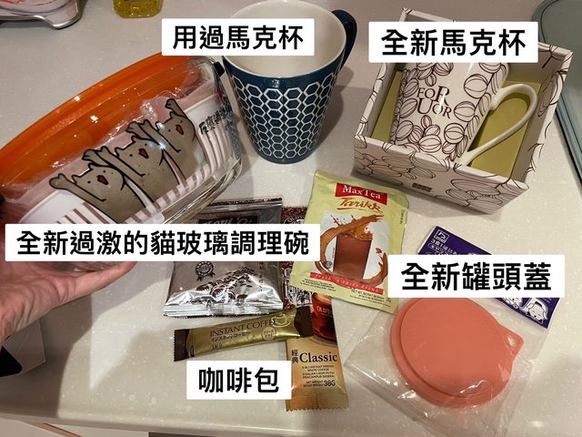 物品項目:咖啡包 貓咪罐頭蓋子 馬克杯 半身鏡 玻璃條理碗 耳環