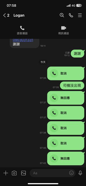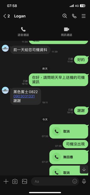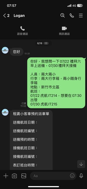 我在06/18用line預約,Logan說前一天會跟我說司機電話,結果我等到07/21晚上七點沒有