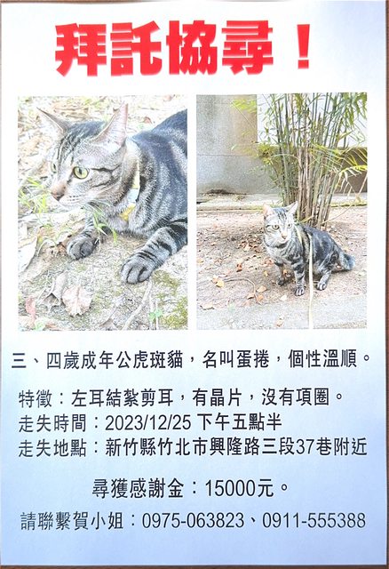 昨天傍晚(12/25)在興隆路三段37巷的翰林苑社區遛貓時,因為被聲響驚嚇,貓貓一時慌 亂掙脫牽繩跑走了,自責到整晚沒睡,如果新竹版友經過附近有看到的話,煩請撥打電話 跟我聯絡!非常感謝! !尋獲感謝金:15000元! 聯絡專線: 0911-555388(賀小姐) 0975-063823(賀小姐) 走失時間:2023/12/25 17:30左右 走失地點:新竹縣竹北市興隆路三段37巷附近 品種:虎斑貓 名字:蛋捲(本來也是浪貓) 性別:男生 年齡:三、四歲 特徵:其實就是一隻虎斑貓貓,身上也沒有項圈,唯一能指認的特徵就是左耳有剪耳過! 也有晶片! 性格:個性非常溫和,但比較膽小,遇到陌生人會躲起來,所以如果有遇見的話,希望能 直接撥打電話聯絡! https://i.imgur.com/zbM8MRU.jpg