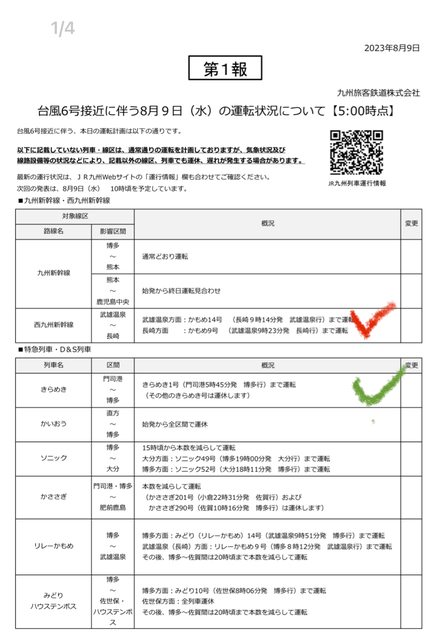 另外如果改成往北到門司港區域 是看綠色勾勾這一列? (但沒有博多往門司港的訊息?) 不好意思第一次碰到颱風沒查詢過 請益版友幫忙 我是點如下網址 https://www.jrkyushu.co.jp/ -- ※ 發信站: 批踢踢實業坊(web-ptt.org.tw), 來自: 126.233.71.233 (日本) ※ 文章網址: https://web-ptt.org.tw/Japan_Travel/M.1691538829.A.1E2