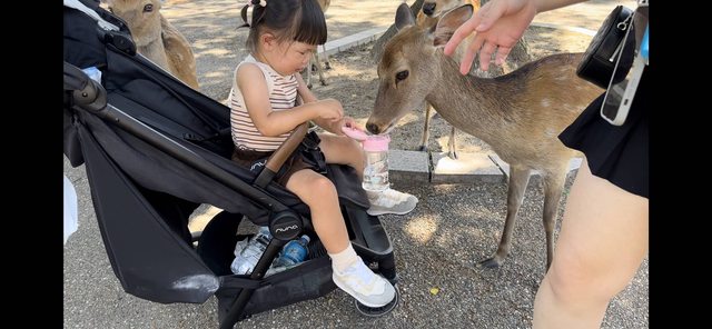 如果有帶小孩去奈良公園的話記得行李箱裡多準備幾隻淘汰的牙刷,硬毛的尤佳,公園裡蠻多鹿便便的,儘管大人再小心都還是會踩到幾坨,更別說無法控制自己步伐的小孩了,回到住宿的地方後就可以開始刷鞋底了XD。另外我跟隊友都好好奇,為什麼這些鹿都不會去搶食賣仙貝的攤販呢,都只搶路人手裡的?我們去前在超商買的水果三明治裝在塑膠袋裡,還掛在推車掛鉤,還能被鹿發現,整袋被叼走,鹿還會拆開塑膠袋欸超聰明的,小孩的水壺吸管還被鹿咬破!囧