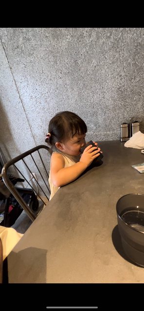 大多數餐廳都沒有兒童座椅,吃過這麼多餐除了連鎖迴轉壽司店外,只遇到兩間餐廳有兒童座椅,還好女兒的身高夠可以自己坐大椅子,否則就只能大人抱著吃了