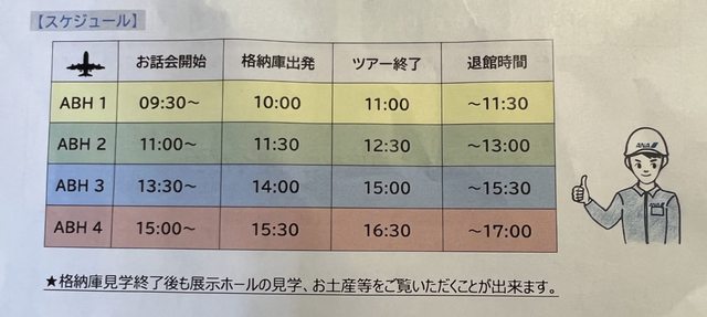 每個場次90分鐘,包含30分鐘的講座,以及1小時的格納庫(飛機的維修棚廠)參觀。
