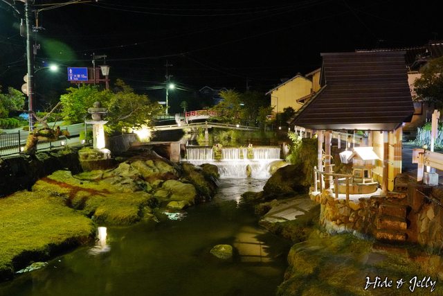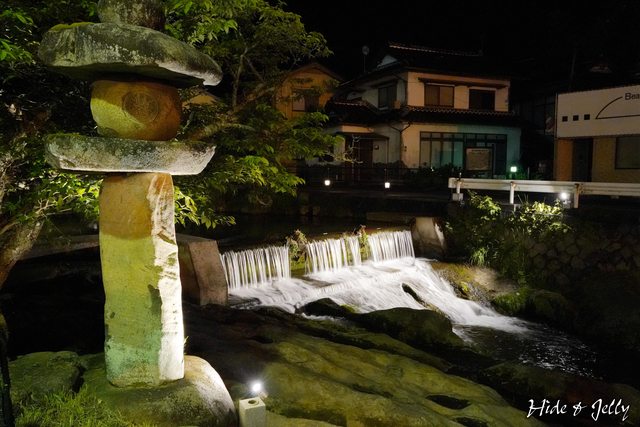 出湯跡的石燈籠與前方攔砂壩的小瀑布,也都有打上燈光,呈現與白天不同的樣貌。