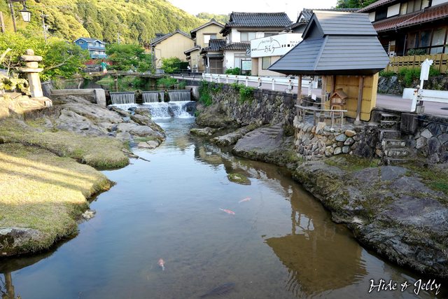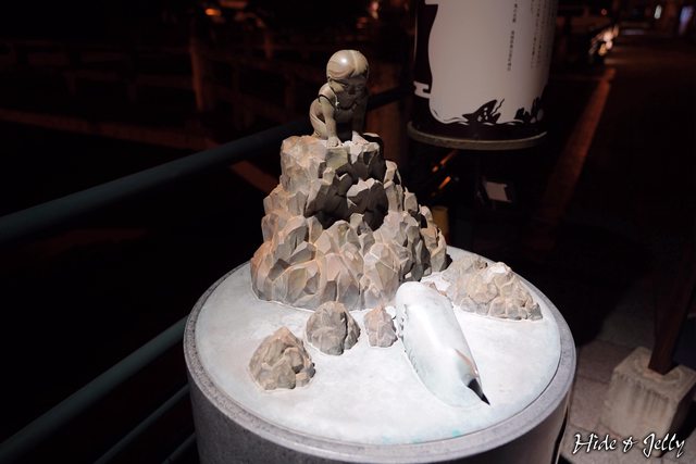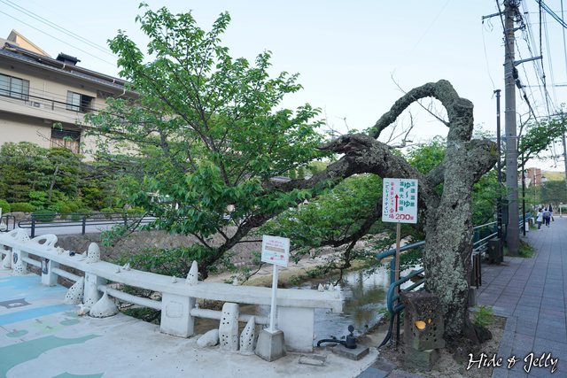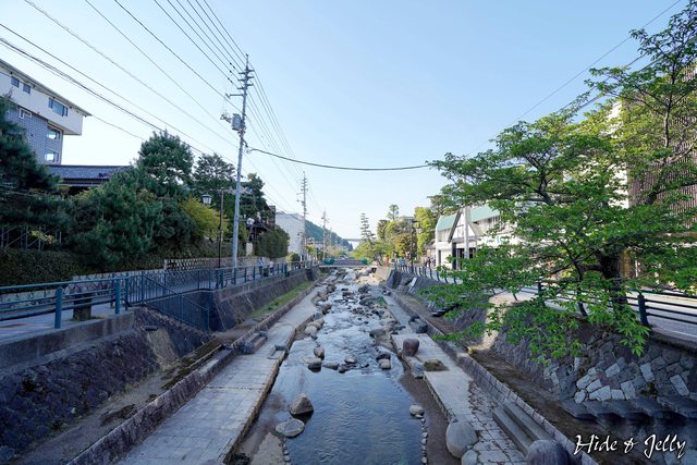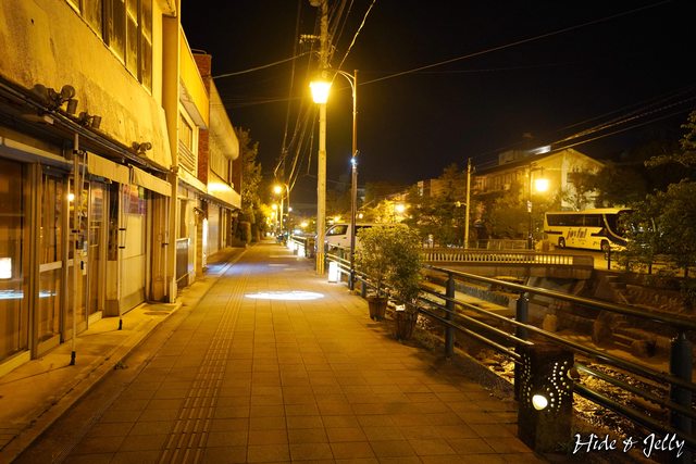 我們走在溫泉街西側的人行步道,沿著河岸有許多地燈,幾乎空無一人的街道上讓我們懷