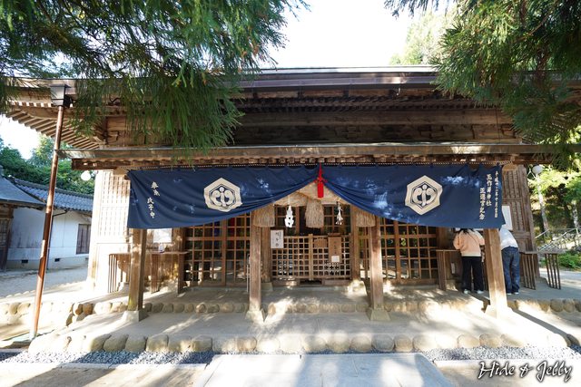 正殿參拜的人絡繹不絕,正面掛簾上的六角社徽中也有勾玉與玉作器具的圖騰。