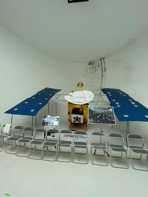大廳後方擺了一個JAXA的人造衛星「HAYABUSA(隼)」實際大小模型。雖然是紙糊的,但