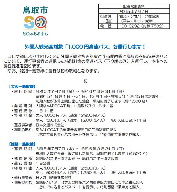 日期:2023/7/7~2024/3/31 外國人出示護照購票大阪/姬路到鳥取單向只要1000円 如果名額到達就會提早結束 大阪到鳥取1000円優惠其實疫情前就有這次算是復活 要注意12/1~1/15不能用 大阪的上車點是難波OCAT 可以寫信到[email protected]先預約 姬路到鳥取1000円優惠是首次推出 姬路的出發站在姬路車站前 -- ※ 發信站: 批踢踢實業坊(web-ptt.org.tw), 來自: 60.249.250.230 (臺灣) ※ 文章網址: https://web-ptt.org.tw/Japan_Travel/M.1693880883.A.92D