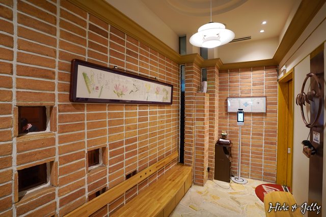 入口的玄關走廊旁,有等待區的座位,一旁是紅磚隔間,突然想到三隻小豬的故事,最堅