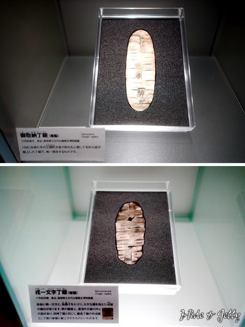 兩種丁銀的複製品展示,丁銀只做為價值的衡量,並不能直接當作貨幣使用,因此每一種